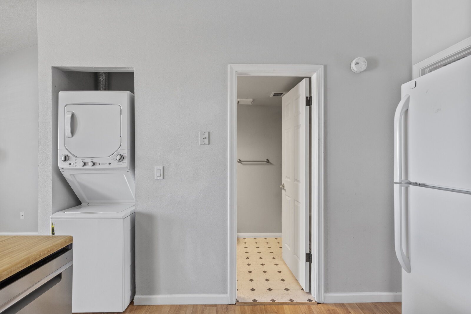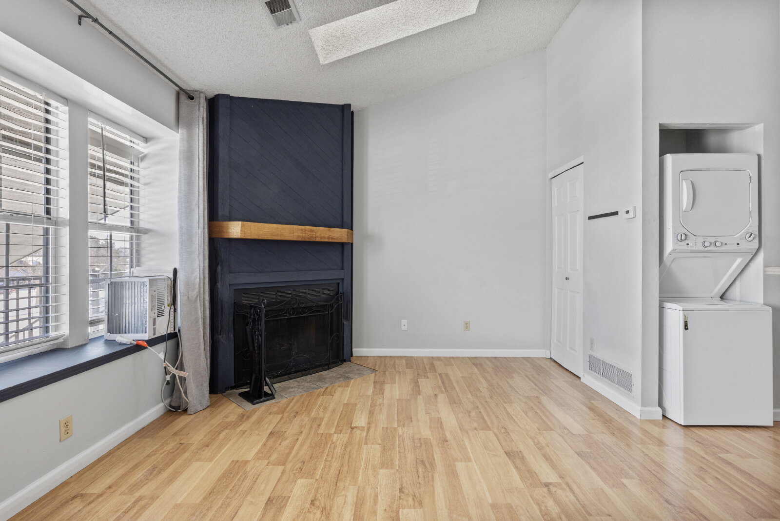 The living area features laminate flooring, a wood-burning fireplace, and large windows with coverings. The open kitchen includes laminate counters, pantry storage, and appliances including a new dishwasher, a refrigerator, self-cleaning oven, and disposal. A stackable washer and dryer is located in the unit.