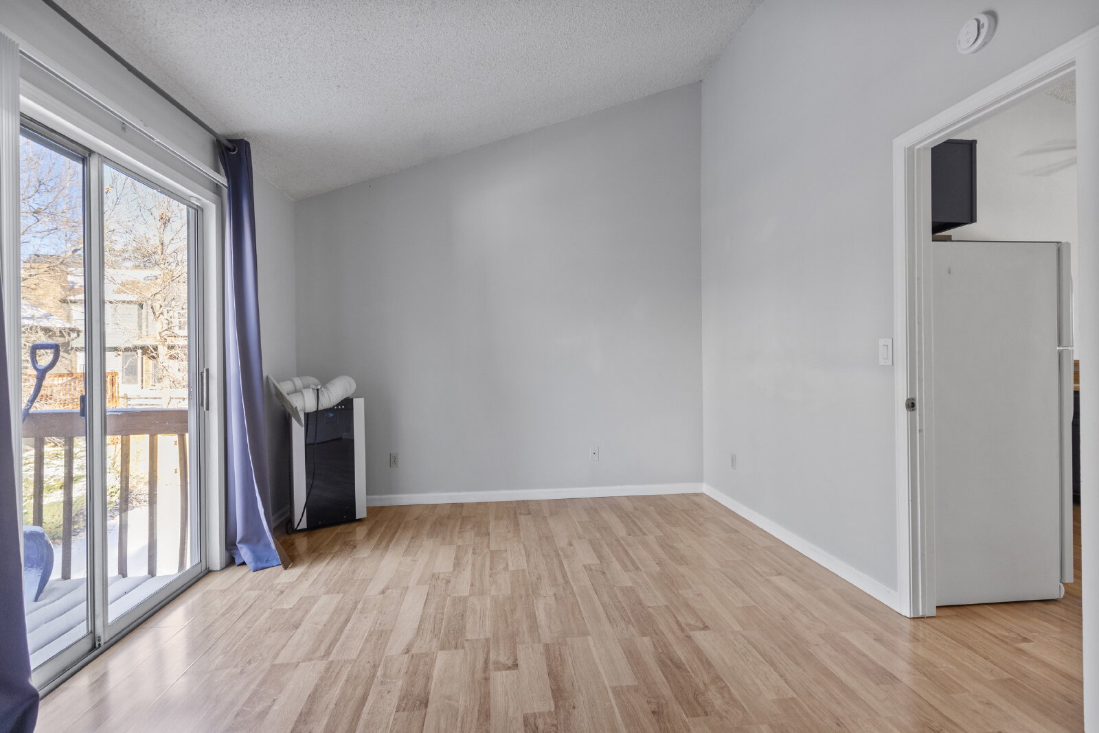 This 1-bedroom, 1-bath condominium is located at 17315 E Rice Circle, Unit E, Aurora, CO 80015 in the Discovery at Quincy Lake community. The unit offers 544 square feet of living space with an open floor plan, vaulted ceilings, and skylights that provide abundant natural light.
