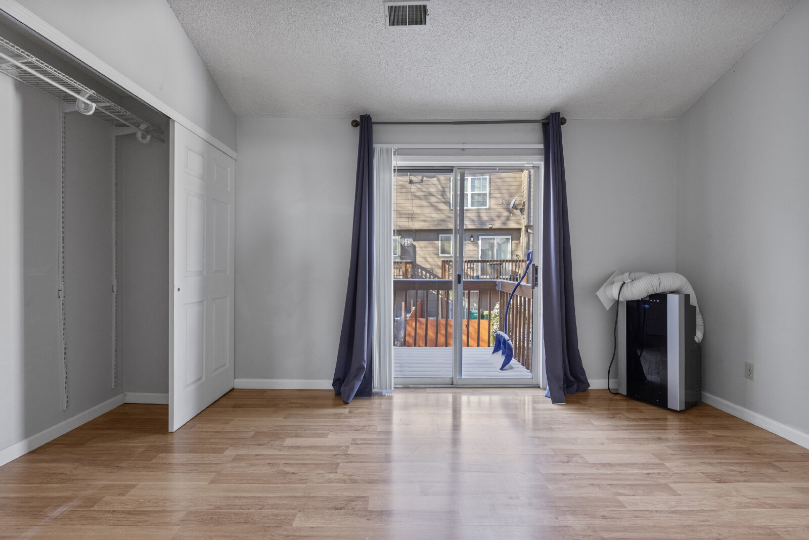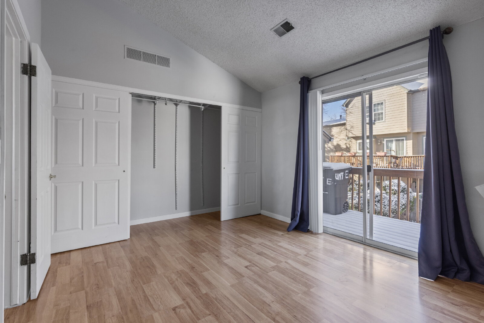 The bedroom includes vaulted ceilings, a wall of closets, and sliding glass doors leading to a covered private balcony with an attached enclosed storage area. The bathroom is a full bath with updated lighting.
