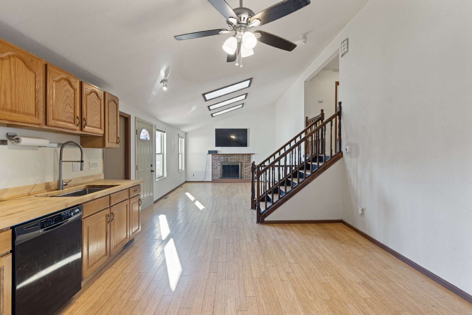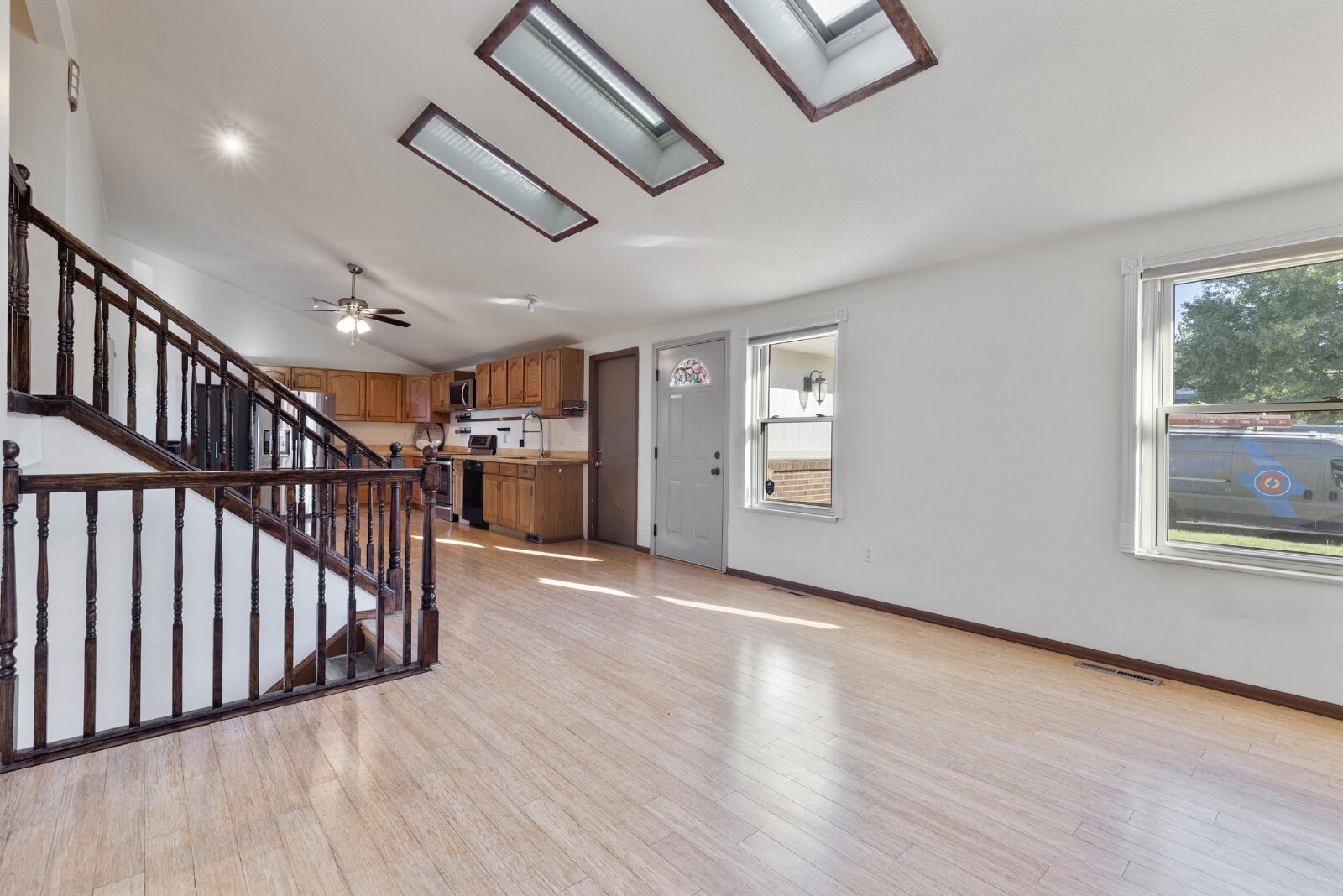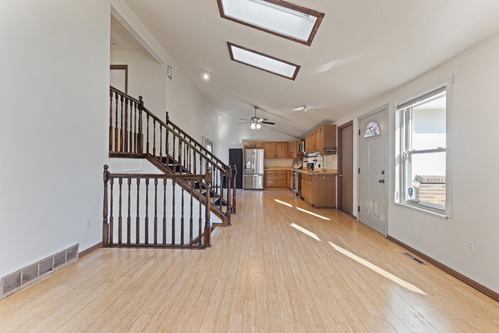 The welcoming front deck sets the stage for enjoying Colorado’s seasons, while inside you’ll find an open floor plan with bamboo flooring, skylights, and a cozy wood-burning fireplace. The open kitchen flows into the living and dining areas, offering an easy space for cooking and gathering.