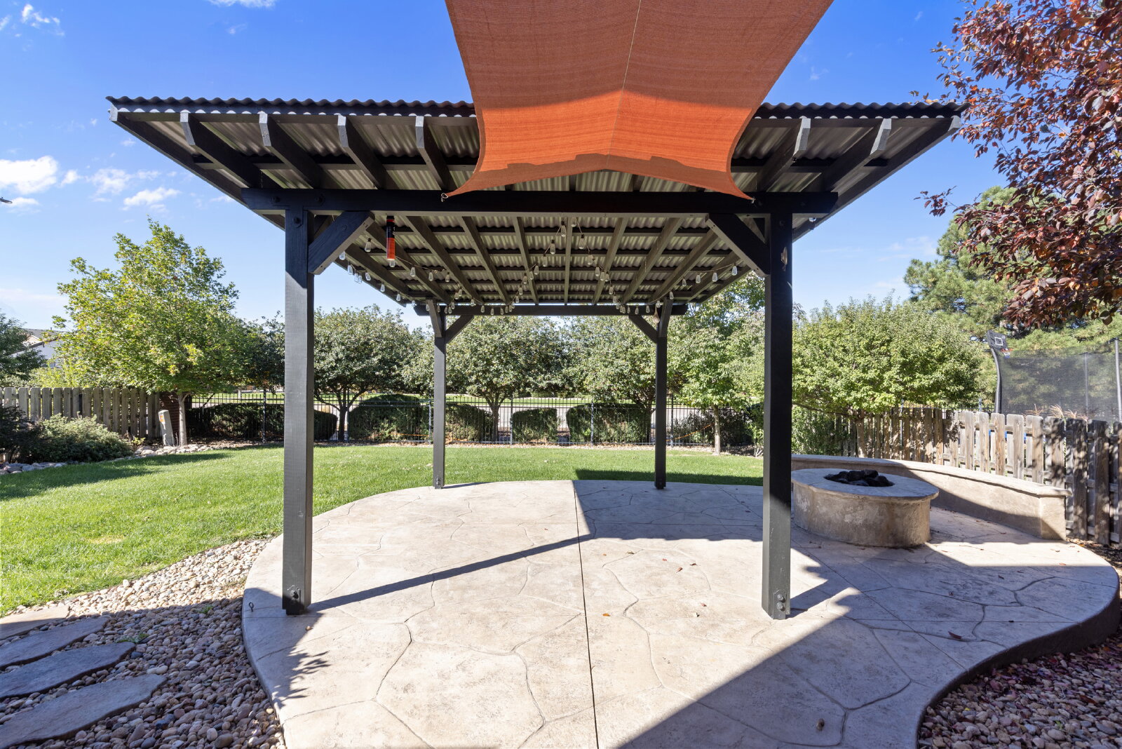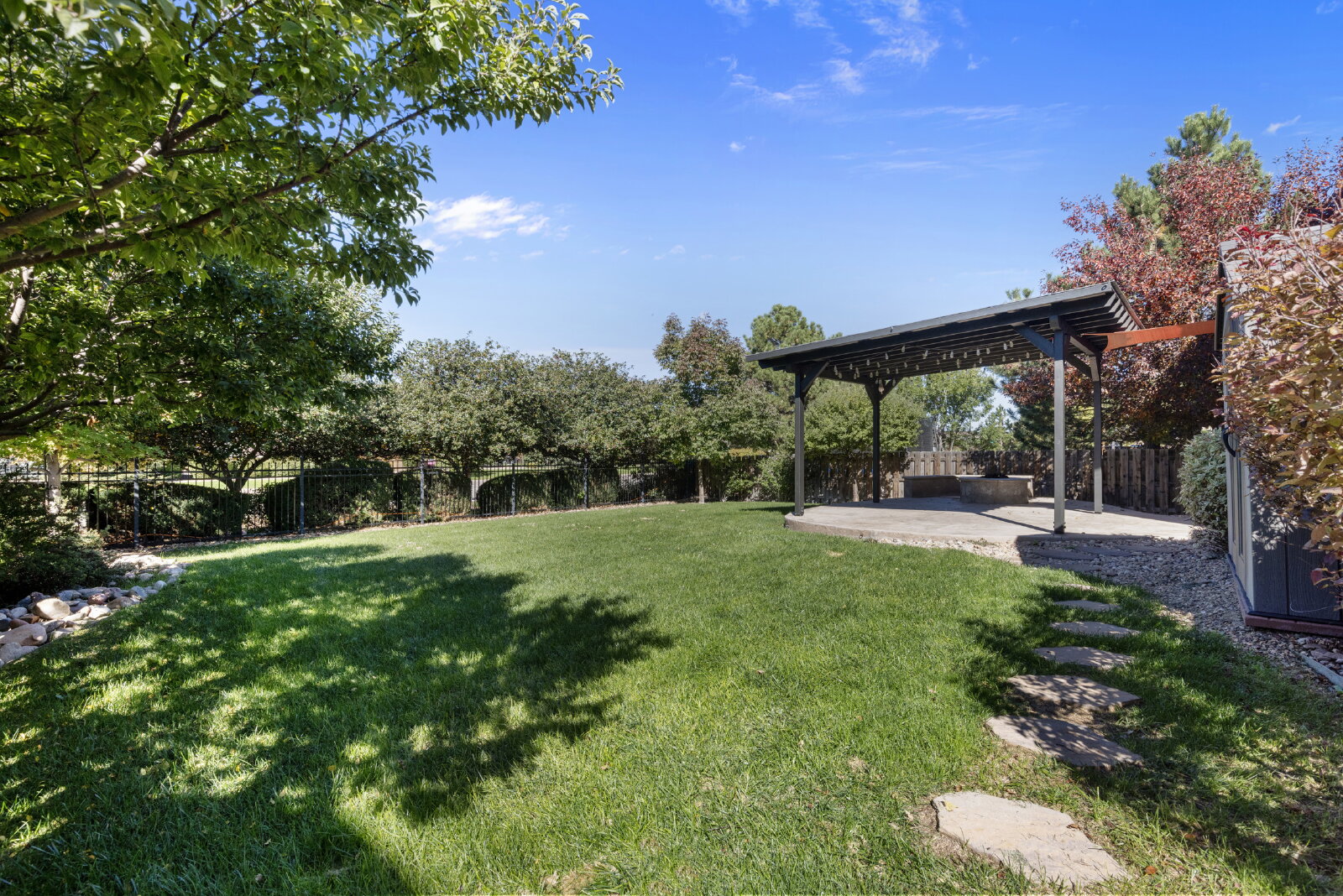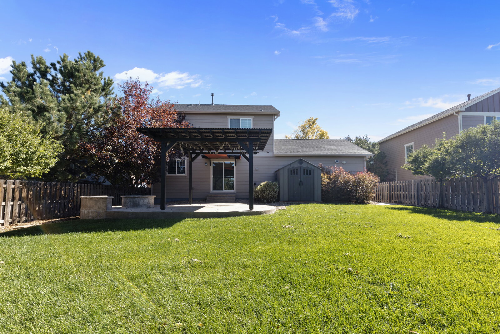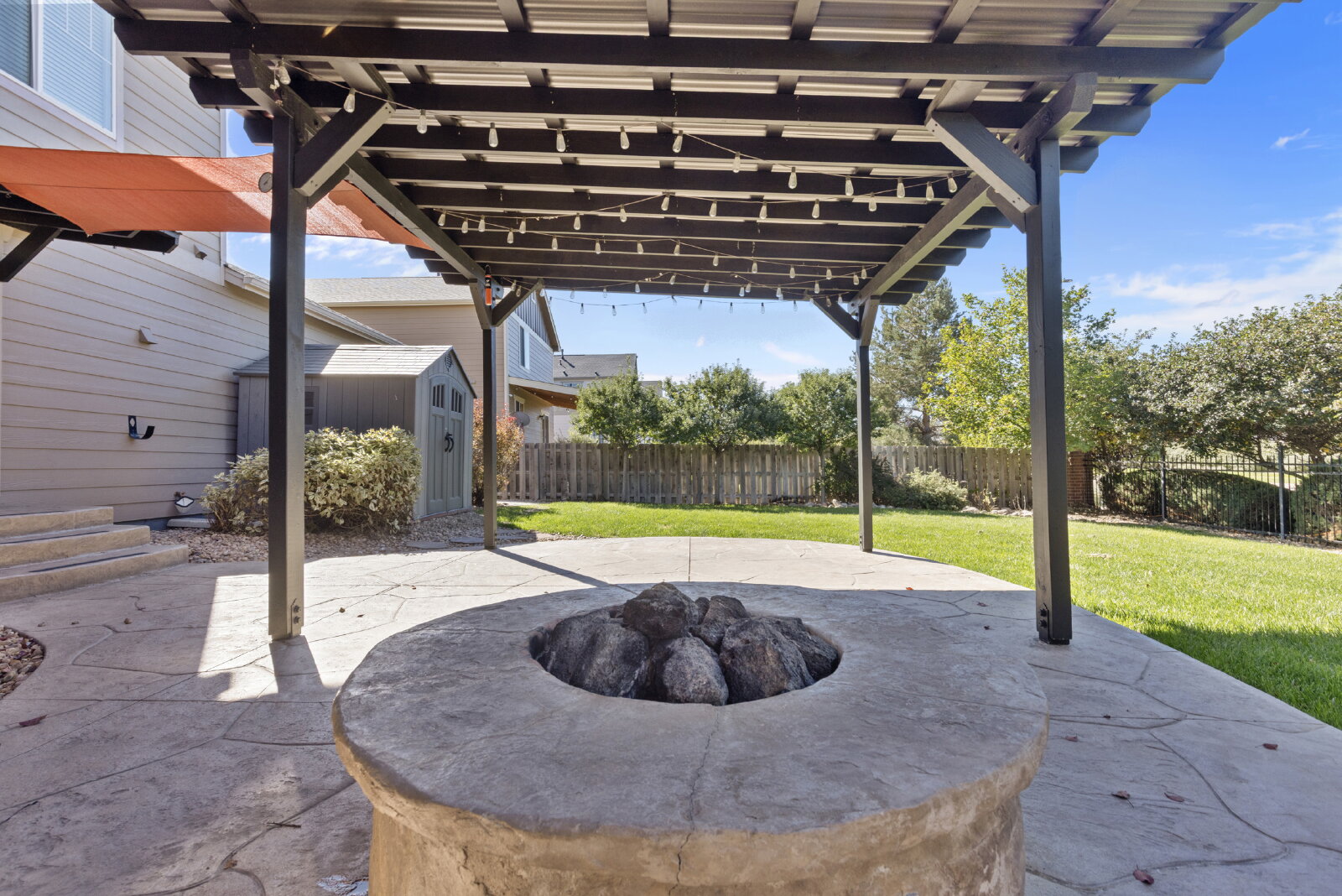 Step outside to a private backyard retreat featuring mature trees, a stamped concrete patio covered by a pergola, gas fire pit, and a storage shed—perfect for enjoying all the Colorado seasons.